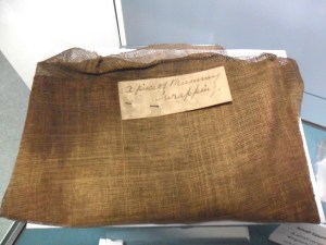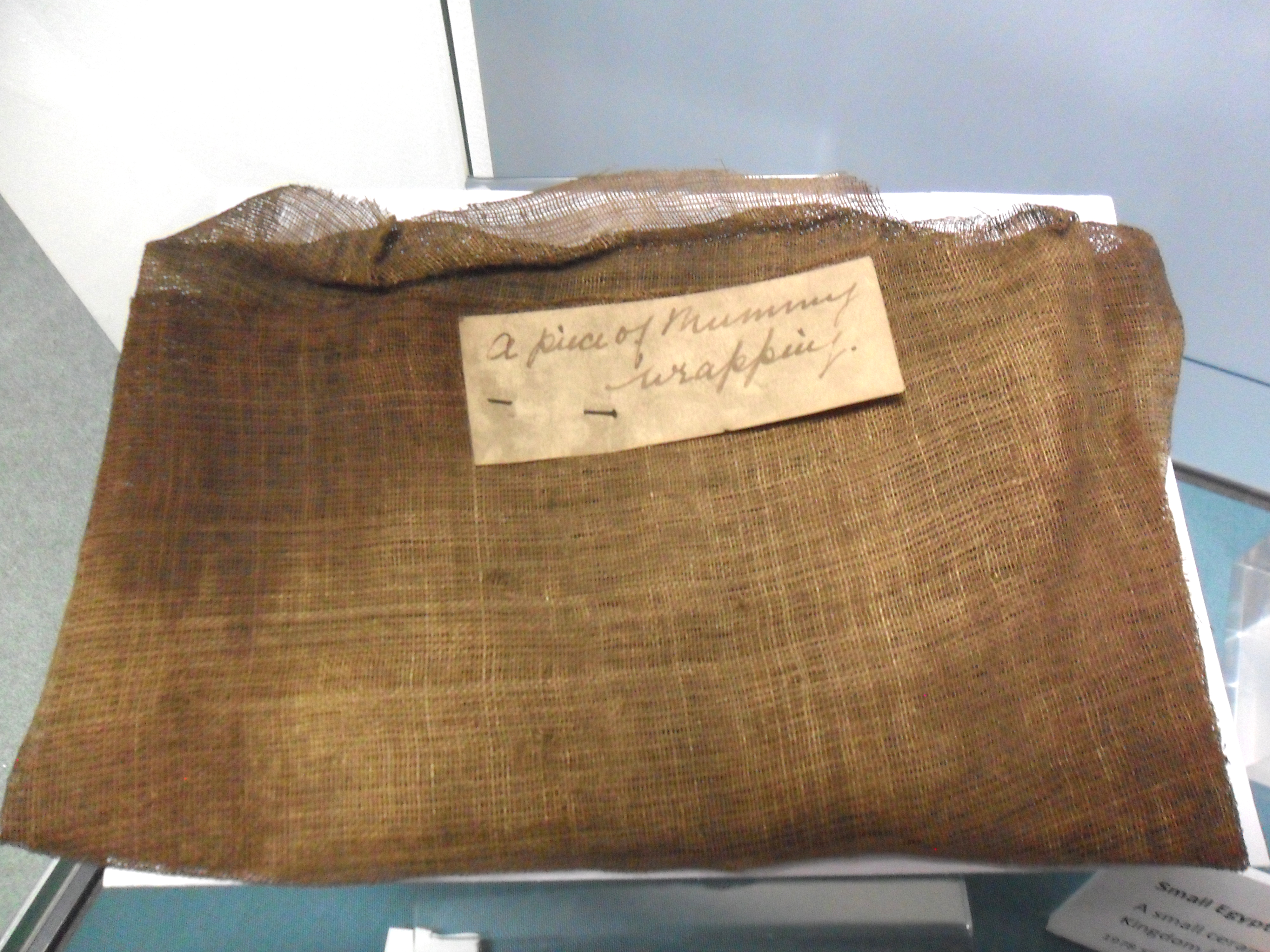 However the most interesting artefact I found was a piece of linen that was branded with a small browning label, which read ‘a piece of mummy wrapping.’ This immediately caught my eye and I began to look at this artefact in more detail, particularly the label. Intriguingly, the label attached to the wrapping is written on the back of a 1929 Christmas Cracker motto taken from Shakespeare’s play ‘As you like it,’ (Act 2, Sc 1). The motto reads ‘Hath not old custom made, This life more sweet.’ Which may provide some clues as to when this mummy wrapping was acquired…?