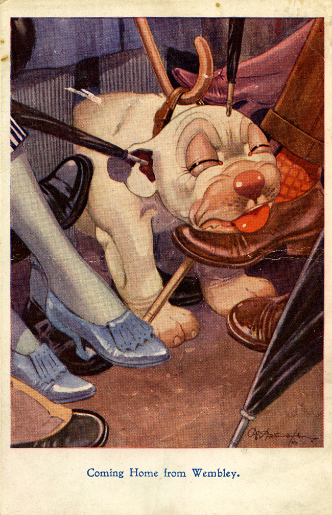 It shows Bonzo the Dog coming home from the British Empire Exhibition at Wembley on a packed Metropolitan Railway train in 1924 or 1925. The fact that it is in colour, and the variety of footwear and impedimenta, make it in many ways more evocative of a visit to the Exhibition than the standard black and white photographs reproduced on more conventional postcards.