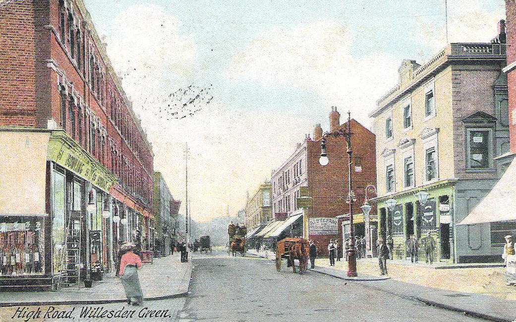 Colourised postcard of High Road, Willesden Green, posted 1909 but taken before the tramlines were laid.  ‘Spotted Dog’ to right
