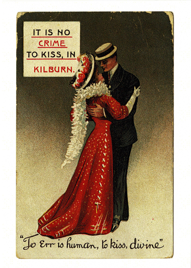Another of our new cards – It Is No Crime To Kiss, In Kilburn. The original was posted on 11th May 1909