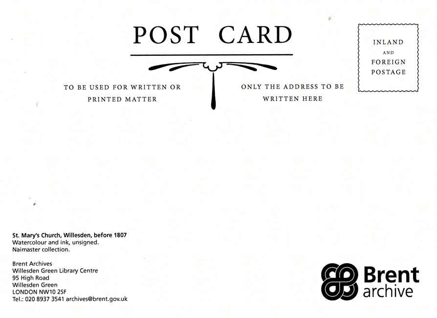 Our postcard showing an unsigned watercolour of St. Mary’s, Willesden, before 1807