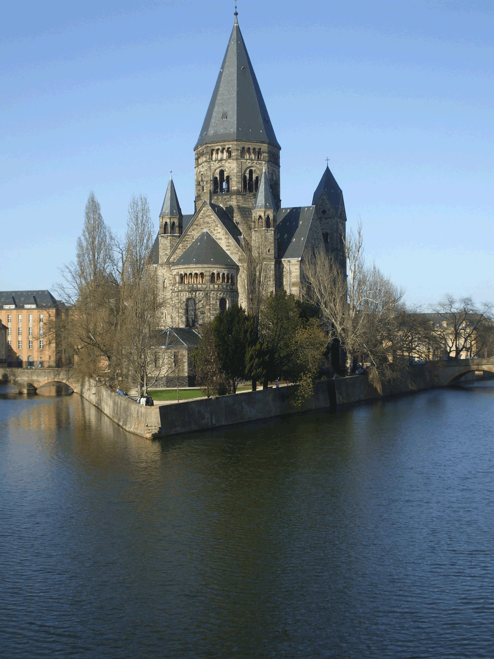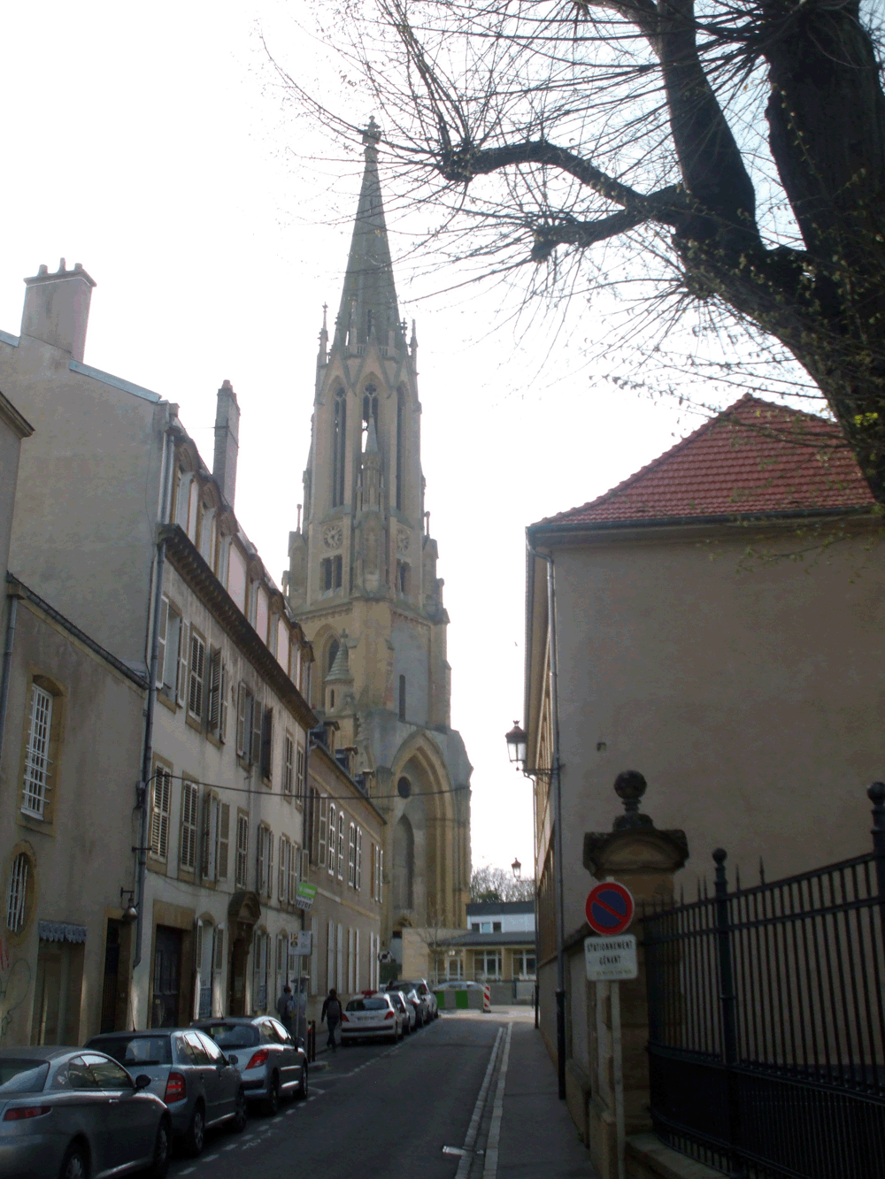 Initially, German architects behaved with sensitivity in Metz. When a Protestant garrison church was built for the German army between 1875 and 1881 it used the same local stone as had been used to build the cathedral, and an inoffensive Neo-Gothic style that was as at home in France as in Germany. The church was very large, and had a spire that was taller than the cathedral towers, which was assumed to be an intentional insult to the Bishop of Metz, who was pro-French, but overall the building fitted into the French cityscape.