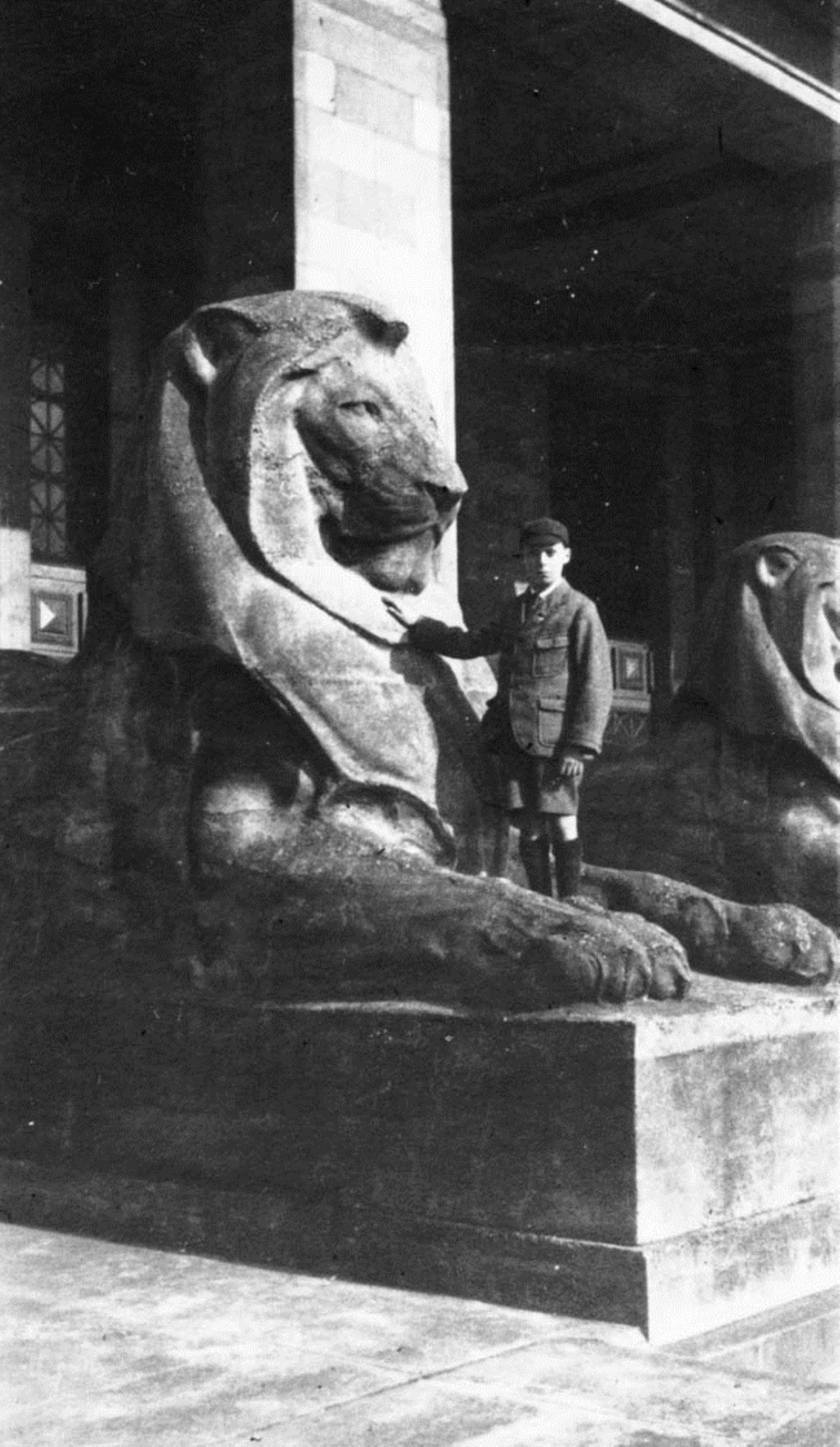 Small boy standing by one of the lions of the British Government Pavilion © Brent Museum and Archives.