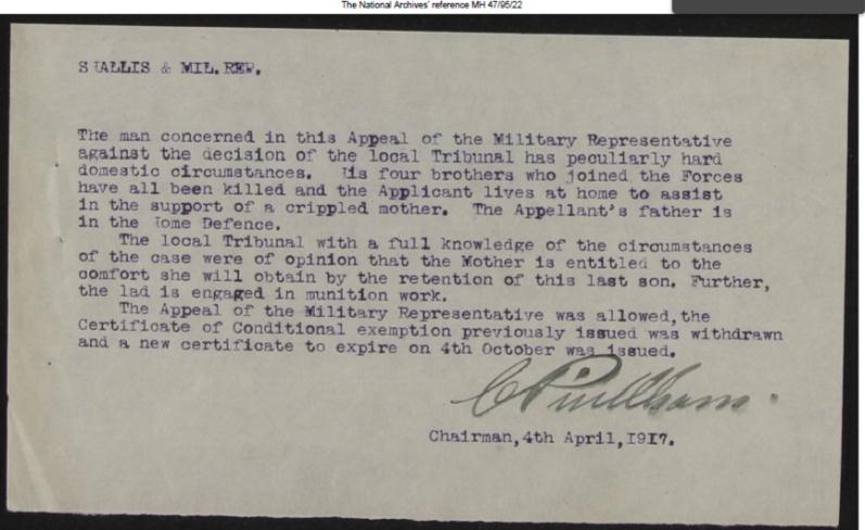 We are very lucky that the records for the Military service appeal tribunal survive for Middlesex and this record (along with other papers) regarding John Gordon Shallis is kept safe for researchers now and in the future. The other Middlesex tribunal records show that very few men were excused military service and so the Shallis story is a particularly interesting story as well as being a particularly sad one.