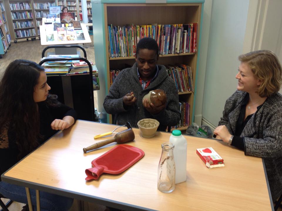 Santino working with some of Brent Museum’s collection, with Nayara and Jo.