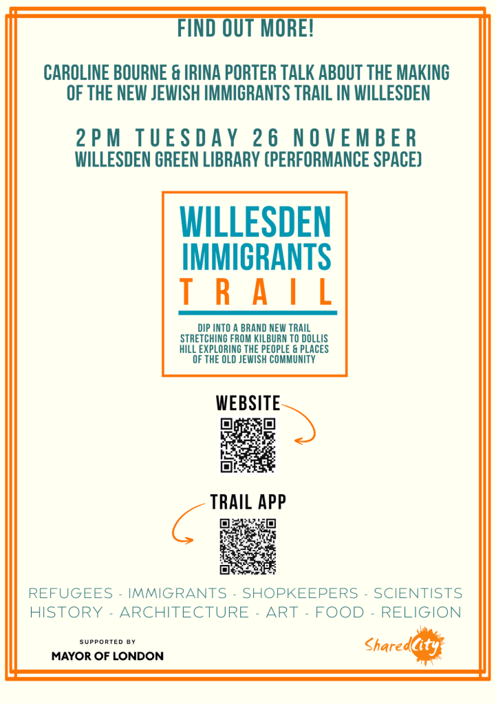 Join Caroline and Irina from Shared City on Tuesday 26 November for a talk about their new Jewish Immigrants trail in Willesden. This trail can be accessed on your phone and runs from Kilburn to Dollis Hill and explores the people and places of the old Jewish community.