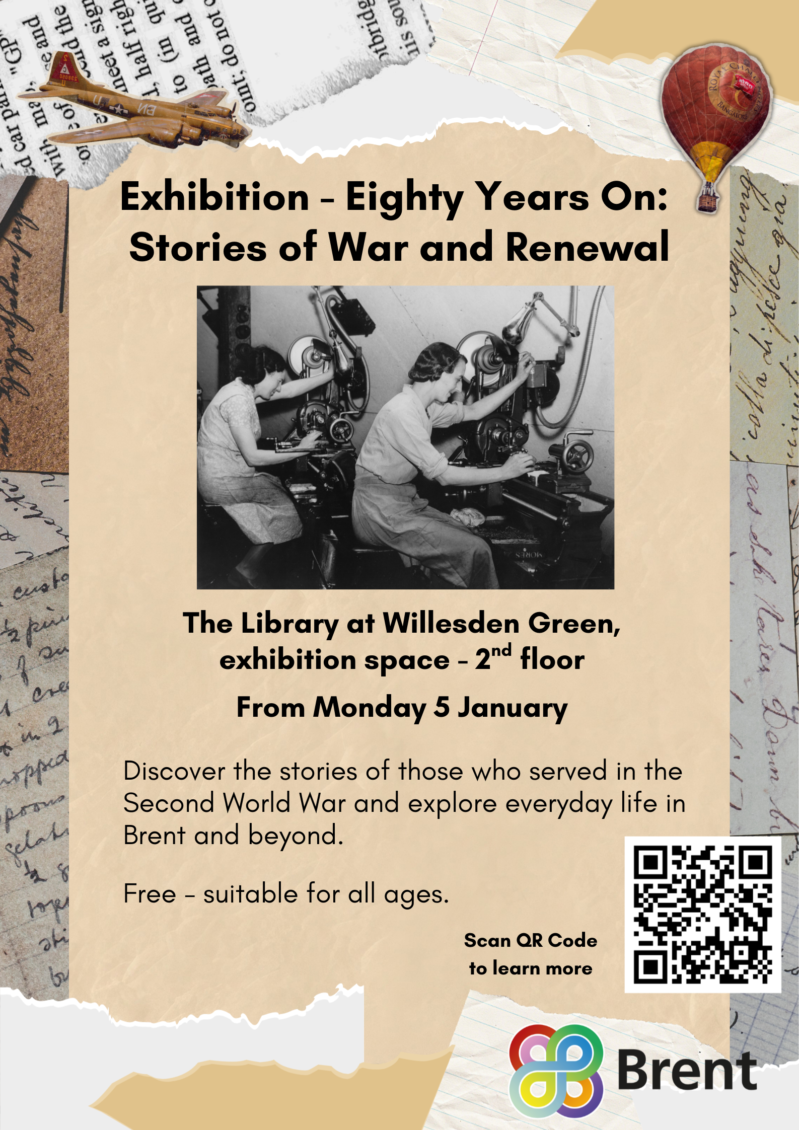 This exhibition brings together stories, objects, and memories from the period and explores key themes from the final years of the conflict. It looks at the final hours of the war and the celebrations that followed, the impact of the Blitz on buildings here in Brent, the role of air raid wardens, and the contribution of global majority people. It also examines how families rebuilt their homes and routines through the use of prefabs and how the poppy became a lasting symbol of remembrance.